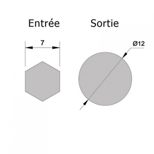 Pièce de volet roulant permettant la transmission de la rotation de la manivelle au treuil. le passe caisson Zurfluh D472 accepte une manivelle ronde diamètre 12 mm et est équipé d'une tige 6 pans de 7 mm en sortie